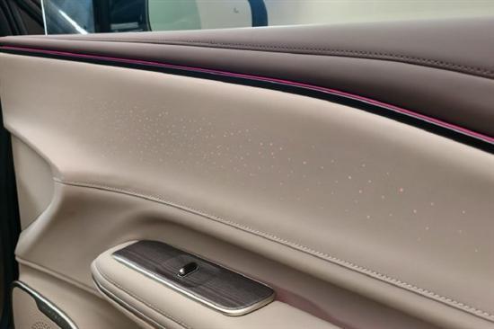 门板上的 “星空壁”氛围灯颇为吸引眼球,官方称采用劳斯莱斯同款的环绕式透光表皮,拥有838颗星点均匀分布,点亮时营造出一种星海倾泻的沉浸感。配合入座即升起的音响单元,仪式感足够到位。