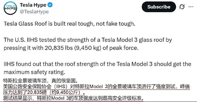 在美国公路安全保险协会(IIHS)对特斯拉Model 3全景玻璃车顶的强度测试中,车顶玻璃峰值压力高达20835磅(约9450公斤),达到了最高安全评级标准。